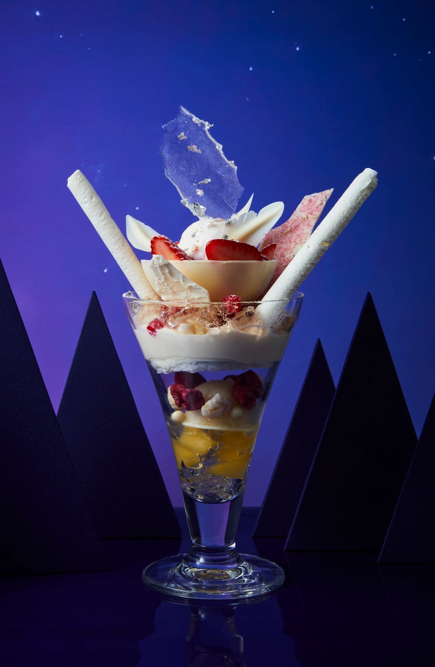 夜空に輝く星に見立てた銀箔が輝く柊型のあめのチュイールに、白樺の木々をイメージしたメレンゲ、ふわふわの雪をまとった羽をイメージしたホワイトチョコレートから食べ進めるパフェ。
