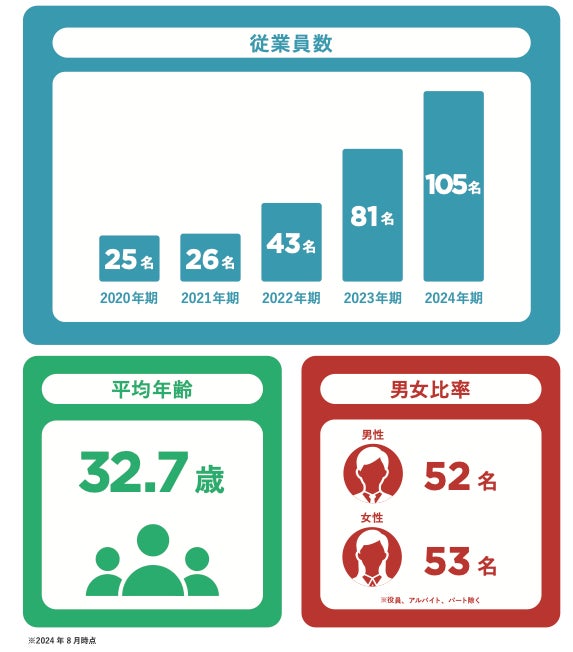 組織は100名を超える規模に成長しました。平均年齢は32.7歳と若いメンバーが多いものの新卒世代から60代まで幅広い年代のメンバーが日々切磋琢磨しながら働いております。