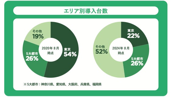 このタイミングで、全国各地の金融機関や地場企業との営業連携を進められたことで、顧客基盤が全国規模でスケールアップいたしました。顧客のエリア別導入台数の構成比率を見ても、2020年8月時点では東京都と5大都市で80%を占めていたことに対し、2024年8月時点では48%と、地方での導入が顧客増の大きな要因となっており、北は利尻島から南は与那国島といった離島までサービス提供エリアを拡大しております。