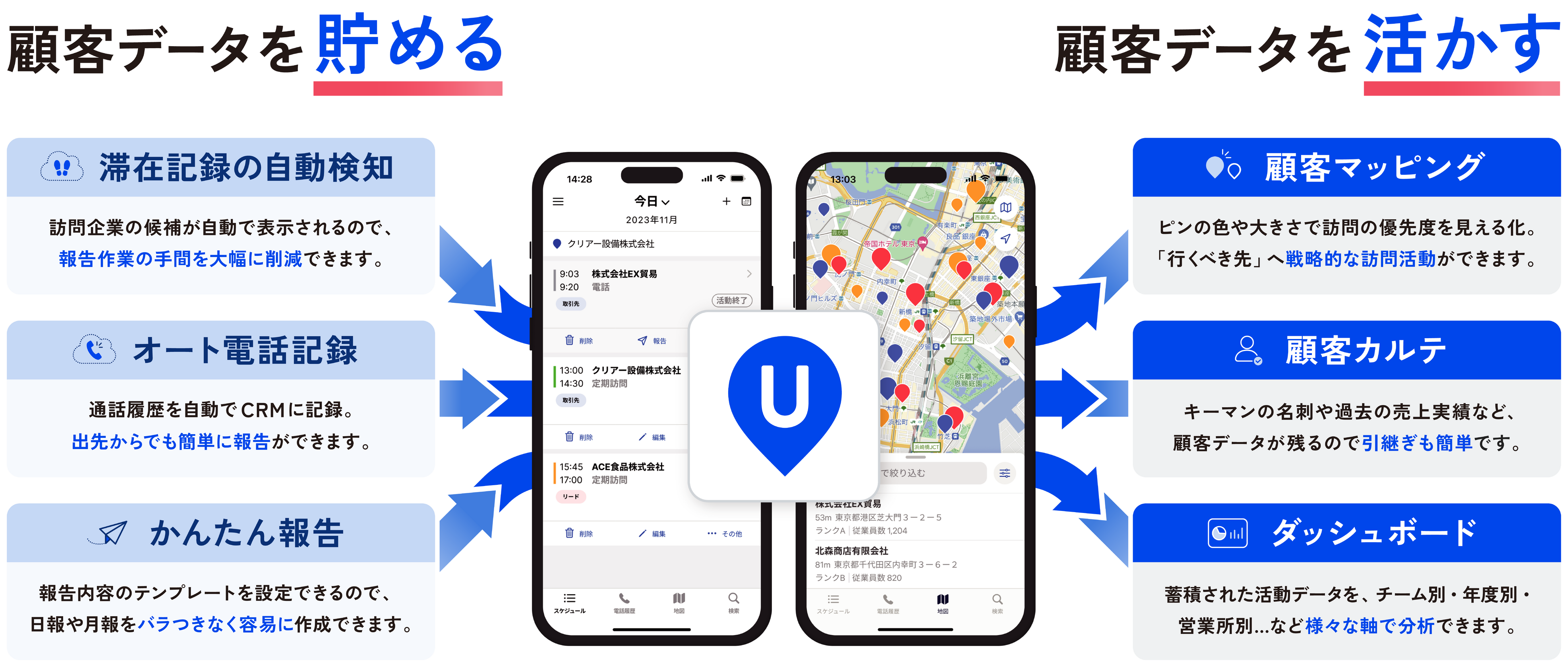 UPWARDは顧客データの記録・活用を効率化するモバイルアプリ「UPWARD」を提供しています。顧客データを“貯める・活かす”ことを軸に、クラウドCRMと連携し、外回り・訪問営業の方々がより創造的に働けるよう、多様なサポート機能を提供しています。