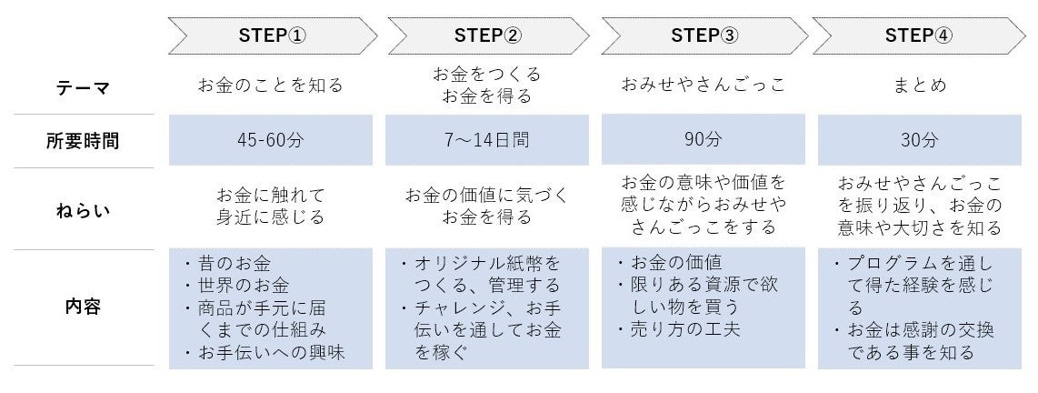 子どもの成長に合わせた内容・時間配分で、通常行事の一環として開催が可能な、幼稚園・保育園で取り組みやすいプログラムとなっており、1日だけの体験教室ではなく、子どもたちが通常行事の中で「お金」に触れ、1~2週間かけて「お金の大切さ」「働いてお金を稼ぐということ=両親への感謝」「お金=ありがとう」を学べる体験型のイベントです。