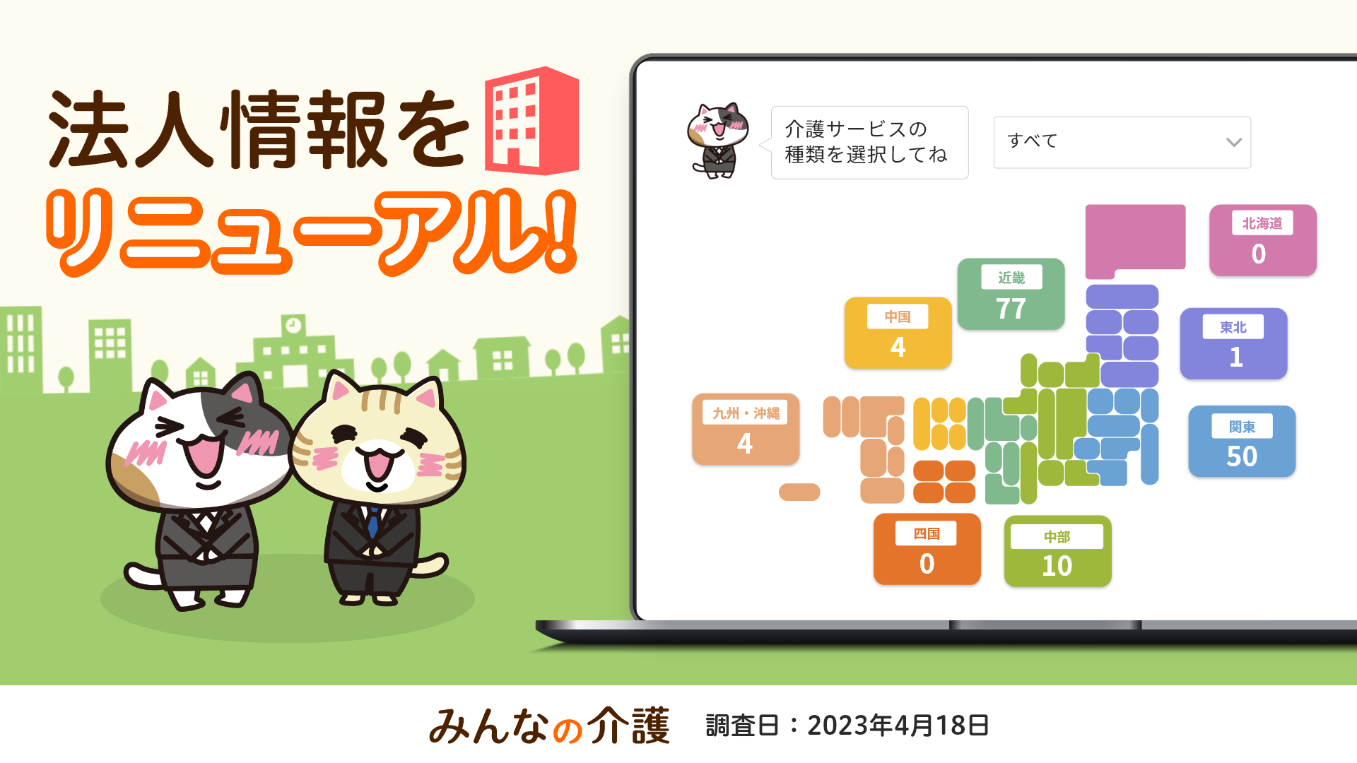 【みんなの介護】新機能! 介護施設を運営する法人ページを大幅リニューアル!エリア別施設情報や外観画像一覧などを掲載