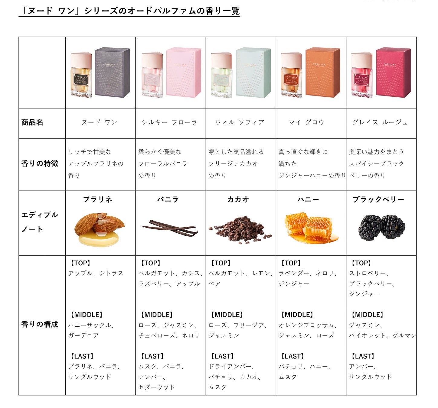 株式会社フィッツコーポレーション(東京都港区、代表取締役:富樫康博)は、フレグランスブランド「ヴァシリーサ(VASILISA)」の「ヌード ワン」シリーズに新商品を投入し、ラインナップの強化を行います。同シリーズは、お菓子のような甘い香りが特徴のグルマン香水として人気を集めています。この度、新たに4種の香りを追加、既存品を含めた全5種類のオードパルファムは、2024年11月1日(金)から、全国のバラエティストア、ディスカウントショップ、フィッツオンライン等で発売いたします。また、一般発売に先駆けて、新ラインナップのミニサイズ香水を、2024年10月25日(金)より、全国のロフト(一部店舗を除く)及びロフトネットストアにて、順次先行販売を開始いたします。