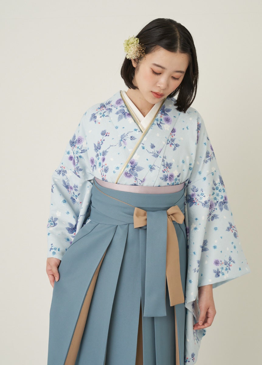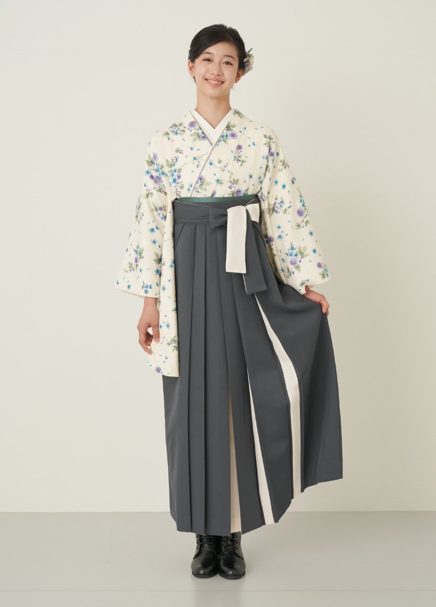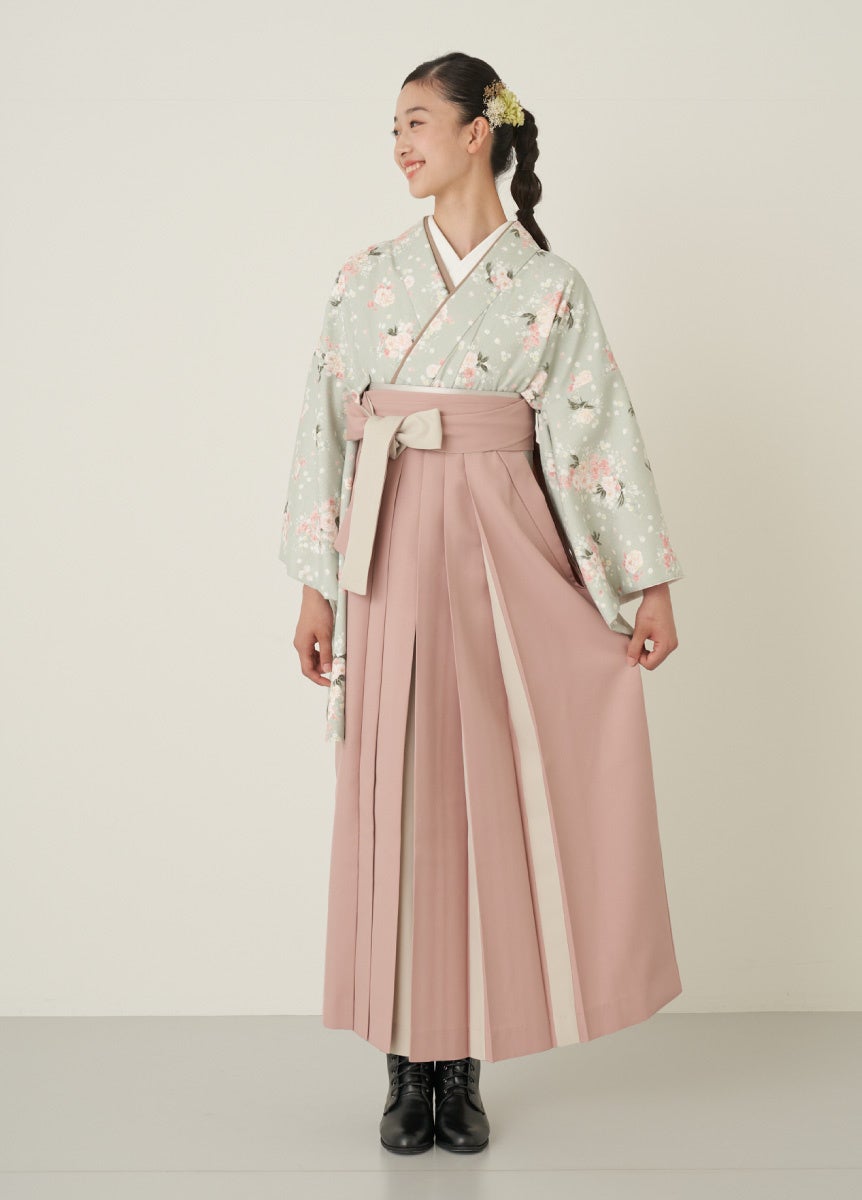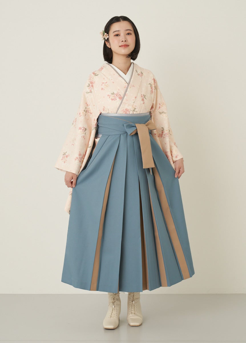 さらに、二尺袖に合わせた新作のバイカラー袴もご用意。春風に吹かれ袴がふわりと揺れた時、さりげなく見えるバイカラーがアクセントになっています。