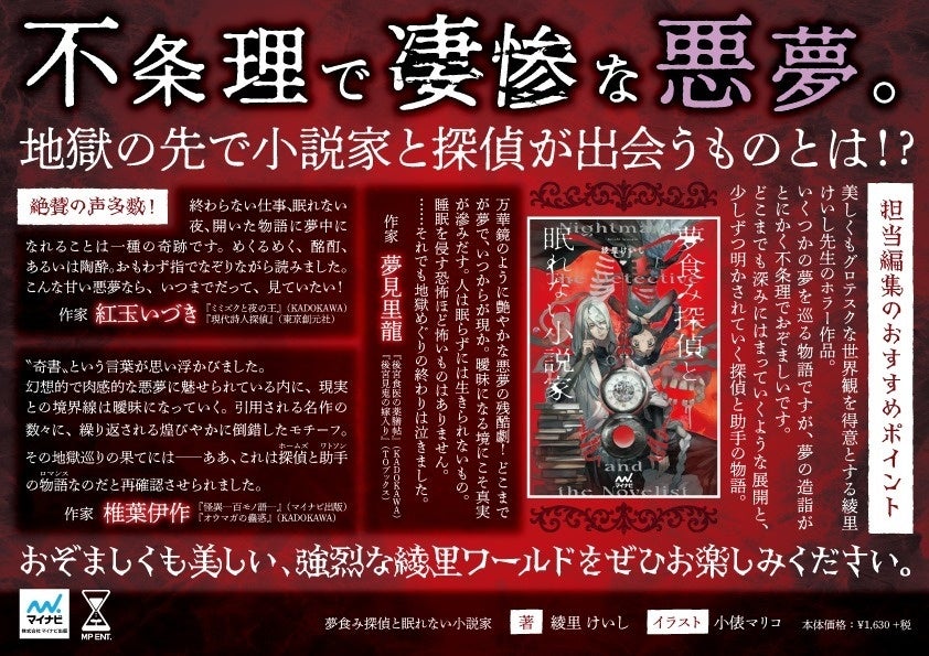 株式会社マイナビ出版(本社:東京都千代田区、代表取締役 社長執行役員:角竹輝紀)はこのたび、『夢食み探偵と眠れない小説家』を2026年2月18日に発売します。専業小説家が、不眠を解決するために、眠りの専門家「夢食み探偵」とともに、さまざまな悪夢を渡り歩く物語。『異世界拷問姫』シリーズ(KADOKAWA)の綾里けいしが贈る、夢とうつつが入り交ざる耽美ホラー譚です。
