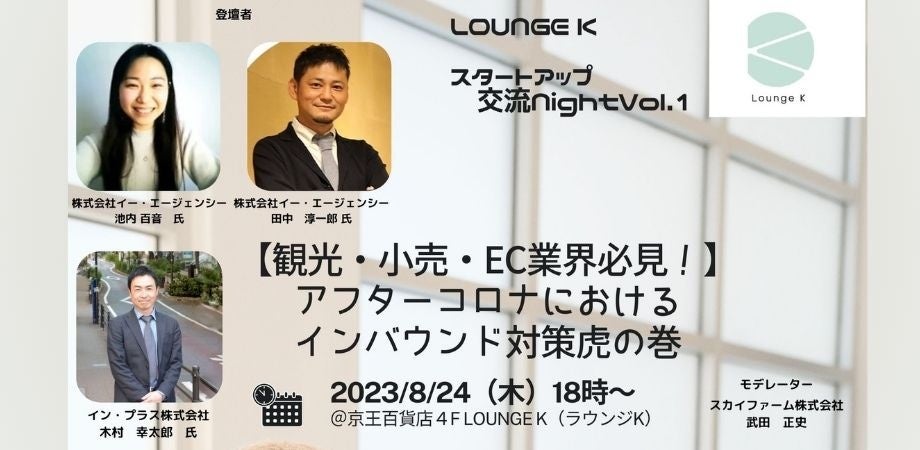 8/24(木)に開催する本イベント第一弾は、「アフターコロナにおけるインバウンド対策虎の巻」と題し、2023年に入り回復の一途をたどる訪日外国人観光客の需要をいかに取り込むかを、インバウンド向け事業を展開する2社をゲストにお招きして、業界の現状と将来のソリューションについて対談いただきます。