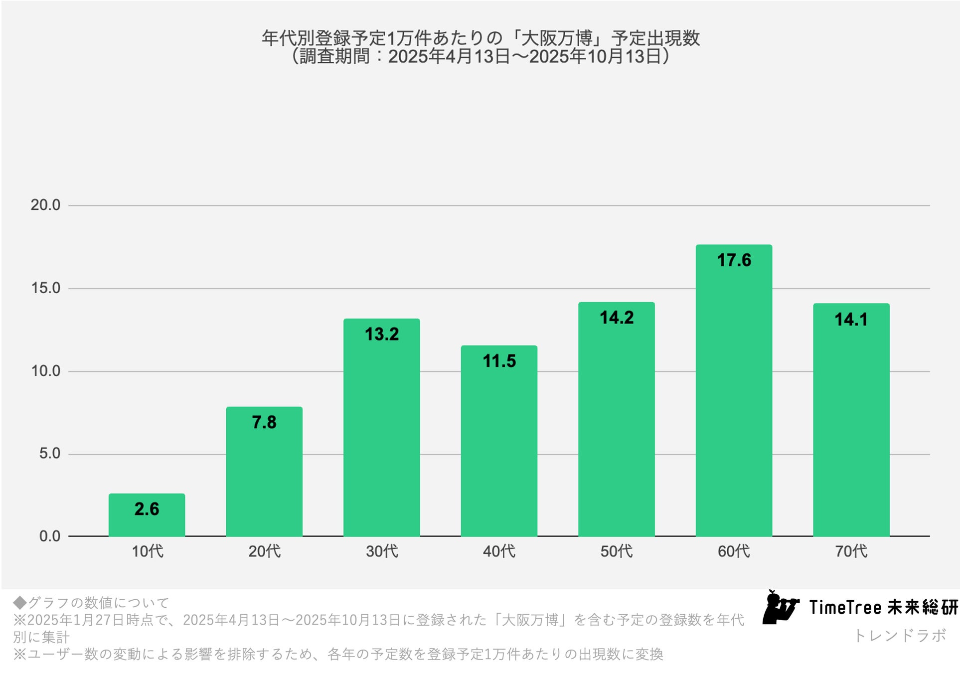 大阪での万博開催は1970年以来、実に55年ぶりとなります。今回の万博開催期間中の「大阪万博」のワードを含む予定の登録データを年代別で分析した結果、 60代(17.6件)が1万件あたりの予定出現数で最も高く 、次いで 50代(14.2件)、70代(14.1件)とシニア世代が高い関心を示していることが明らかになりました。前回の「大阪万博」をリアルタイムで経験した60代、70代にとって、今回の万博は過去の思い出と未来をつなぐ特別な機会となっているのかもしれません。