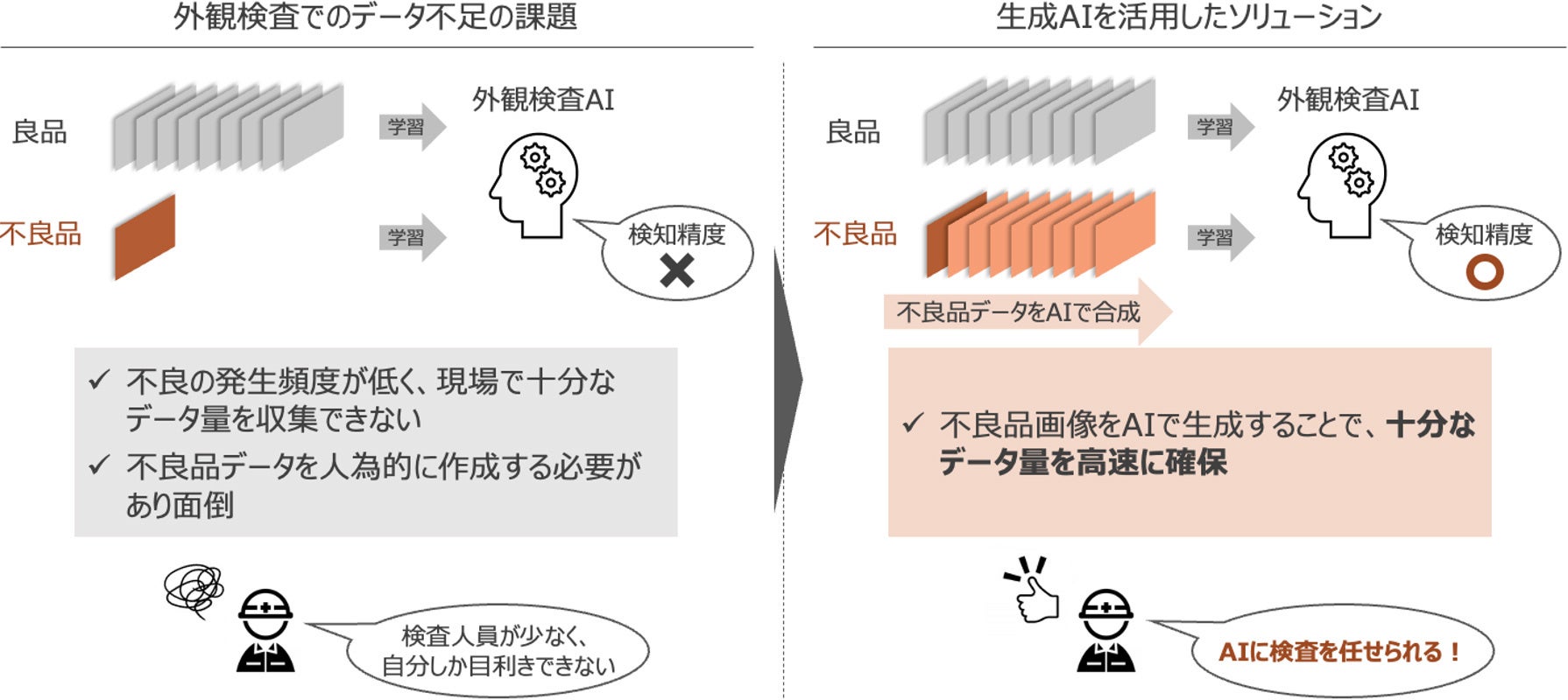 製品などの外観検査の領域ではその傾向が特に顕著で、日本の製造業は製造品質の高さから、一般的に不良品のデータが不足するというケースが多く見受けられます。