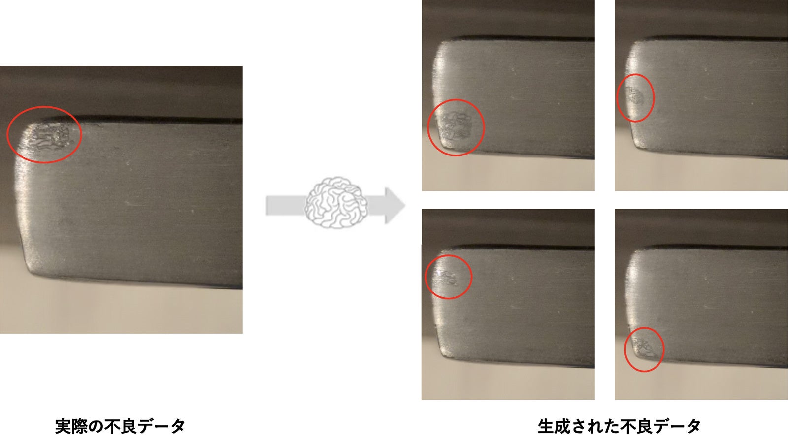 少数の不良・異常データから様々なバリエーションでの不良・異常データを生成する技術です。外観異常検査などで不足しがちな不良のデータにおいて、不良データを大量に生成することでトレーニングデータ不足を解決し、検知AIの精度向上を実現することができます。