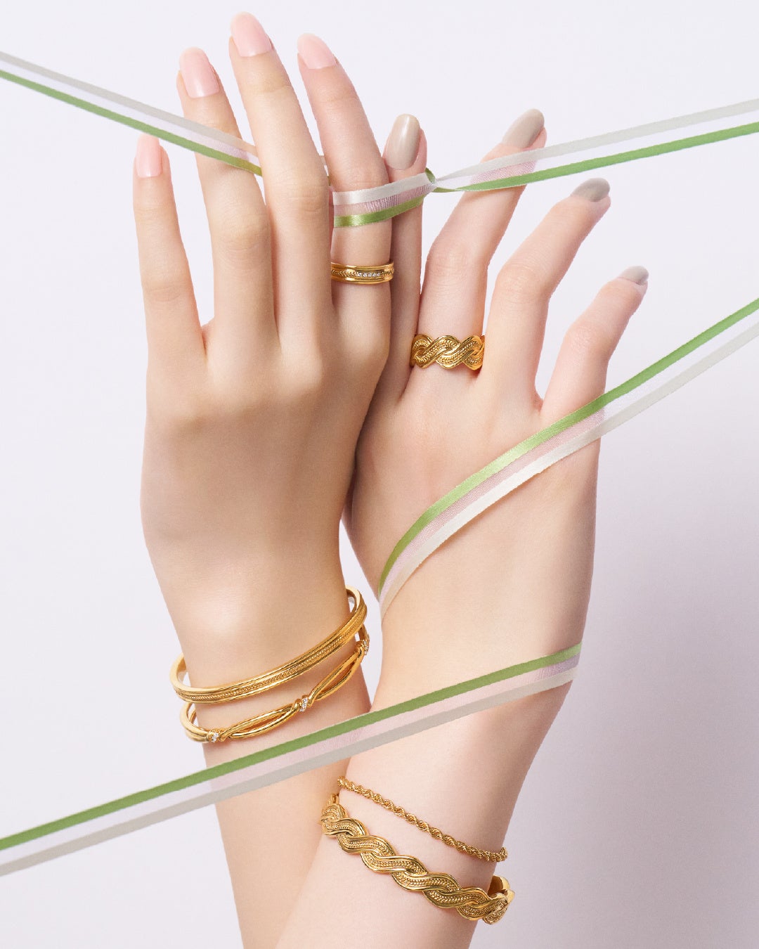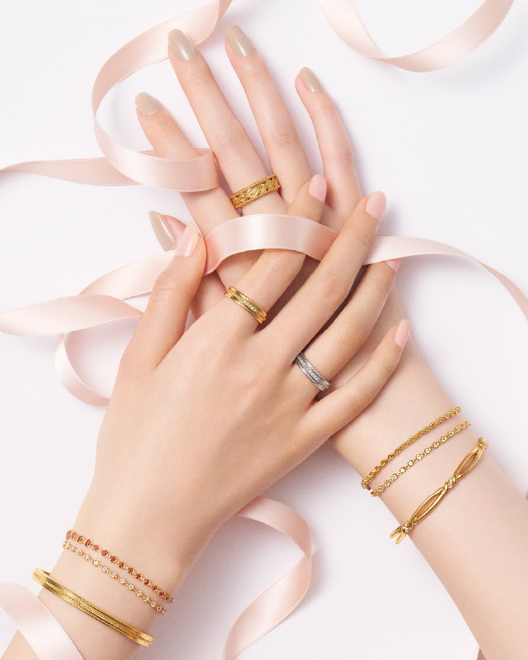 編み込まれたような文様で仕立てられたリング・バングルは、存在感のあるフォルムが特長。一点身に着けるだけで主役になるデザインは、手元に華やかさと個性豊かな表情を与えます。