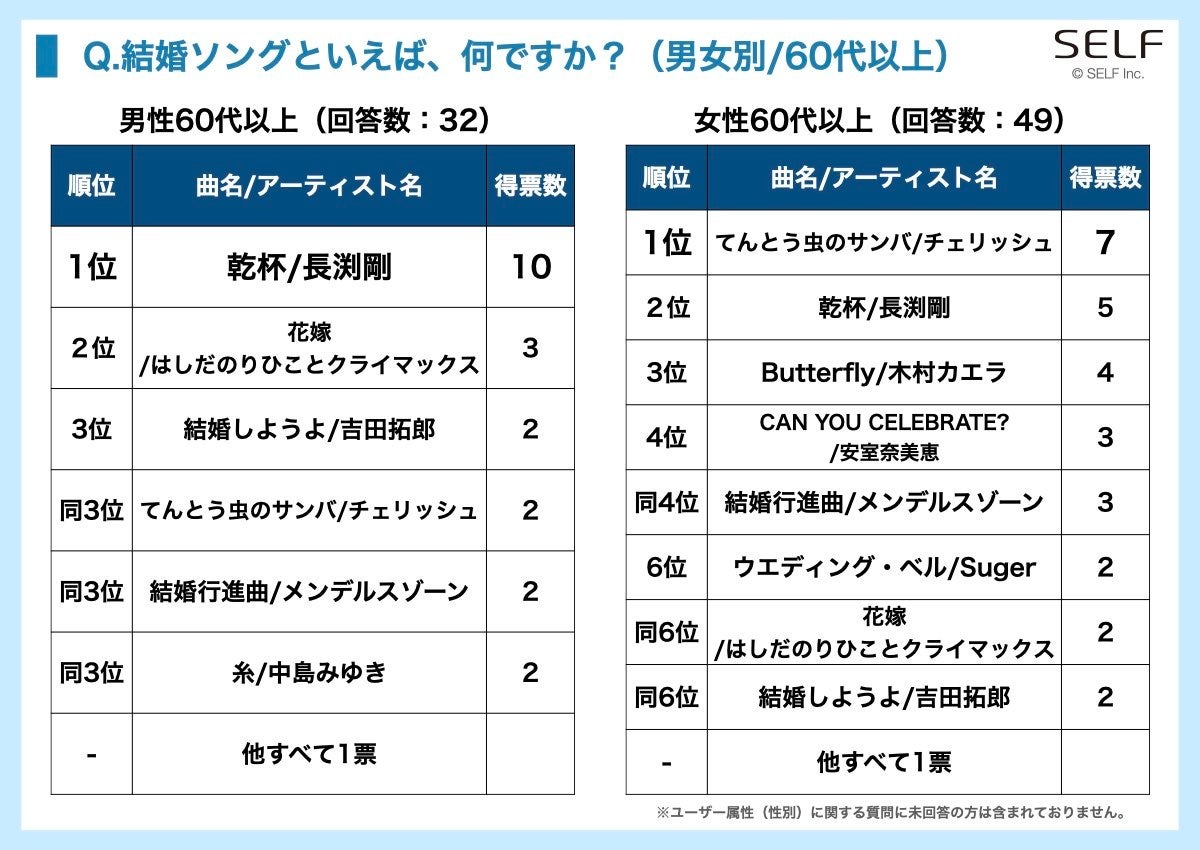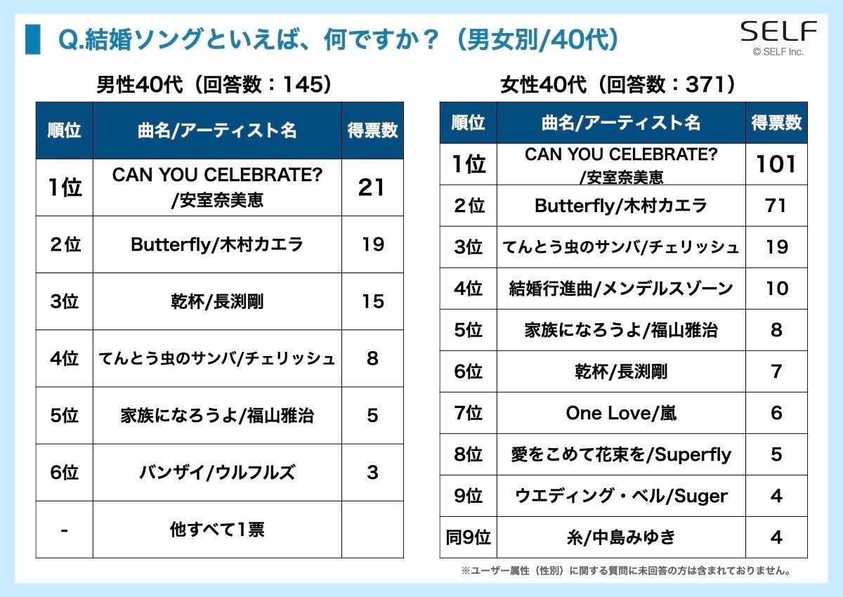 1位『Butterfly』と2位『CAN YOU CELEBRATE?』は全体結果と同じものの、3位以下は大きく異なりました。特に、女性では10位の『乾杯/長渕剛』が男性では3位にランクインしているなど、男女によって結婚ソングへのイメージは異なるようです。