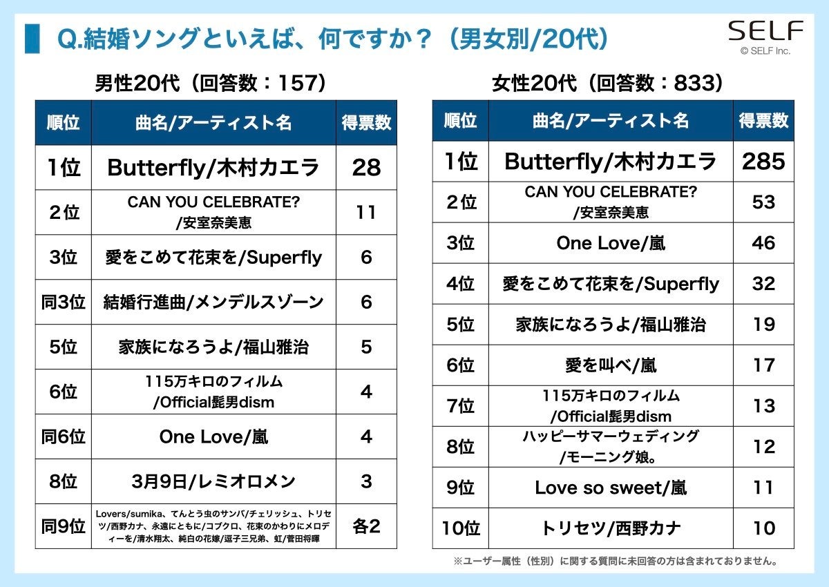 特に20代女性では『Butterfly』への票が際立って多く、34%超もの人が同曲を結婚ソングとして挙げています。