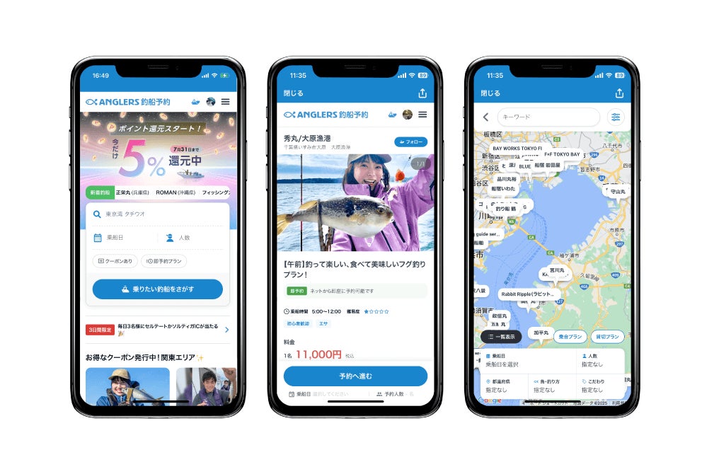 予約方法は、プラン選択画面から乗船日と乗船人数を選択して予約をするだけ。スマホ一つで電話をすることなく釣船を予約できます。また、釣りアプリ「ANGLERS」に掲載されている約650万件の釣果から「今釣れている釣船」を探すことができます。2024年6月4日にサービスリリース後一年足らずで累計11,000件以上の予約送信数を獲得しています。掲載店舗は関東圏中心の約150店舗から徐々に全国展開を実施し、2025年6月時点で400店舗を突破しました。