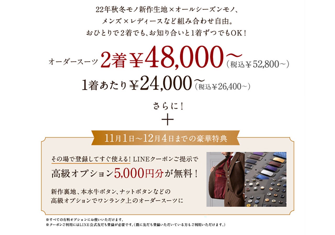 既製品では味わえない、抜群のサイズ感や体にフィットする着心地を、スーツとご一緒にぜひお楽しみください。