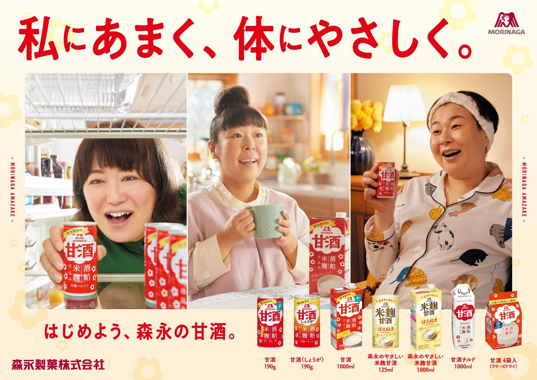 「森永甘酒」は1974年に缶入りの「甘酒」を発売して以来、酒粕・米麹の両方をバランスよく配合した品質で、トップブランドとしてお客様にご好評をいただいております。今回のCMでは森三中の3人がストイックに体のため元気のために奮闘しますが挫折し、毎日様々なシーンで体のために甘酒を飲んでいるシーンを描いている内容になっております。体にやさしい甘酒ならではの魅力を発信してまいります。