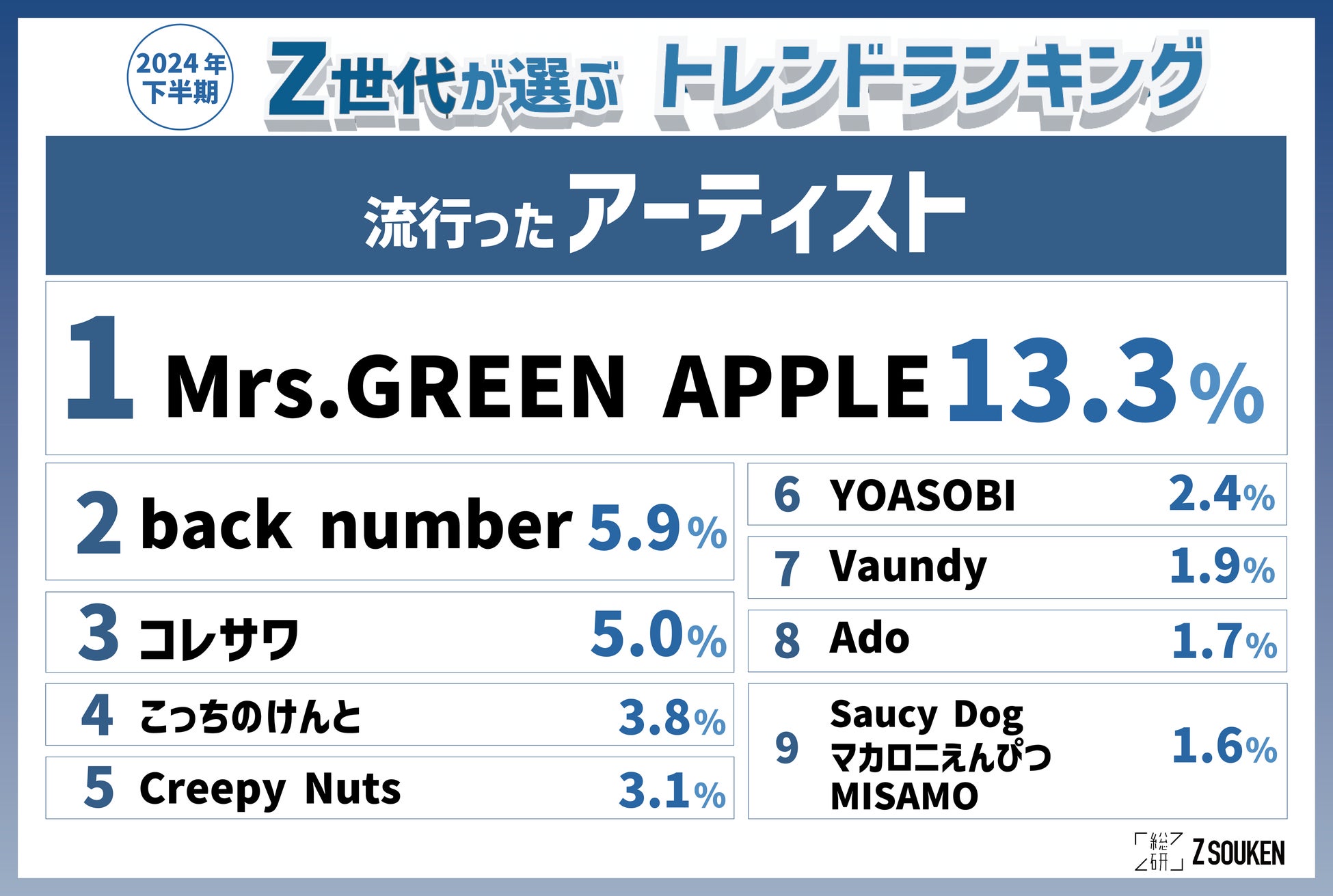 Mrs. GREEN APPLEが1年を通して1位に!楽曲のジャンルが幅広く、歌詞に共感する人多数