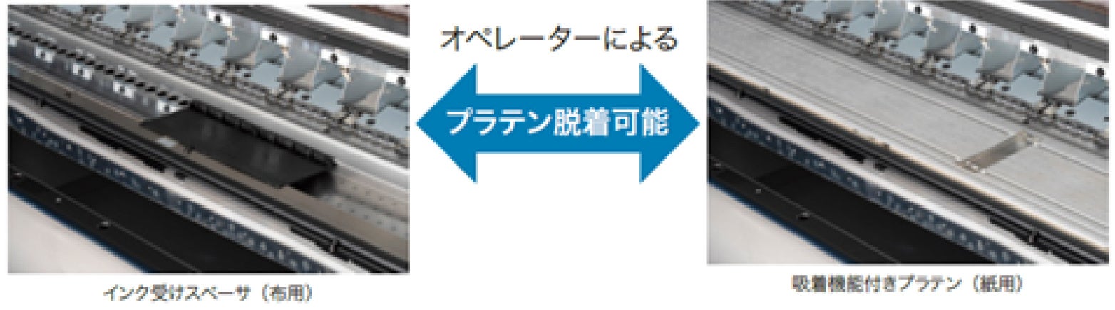 布地と昇華転写紙、プリントする基材毎に最適なプリント機構を搭載しており、これらはオペレーターによってリアルタイムに切り換えが可能で、少量多品種生産を実現します。