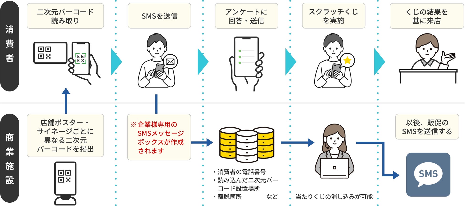 本サービスを活用すると、企業は店頭やチラシ上で二次元バーコードを提示し、消費者はそれをスキャンすることで販促キャンペーンに参加できます。本サービスは、アンケートの回答や、スクラッチくじの実施、クーポン提供など一連の販促活動を全面的にサポートします。さらに、アンケートやクーポンの利用状況、DM・チラシへの反応や来店行動を分析することで、企業はデジタルマーケティングを活用した効果的な販売戦略を立案できます。