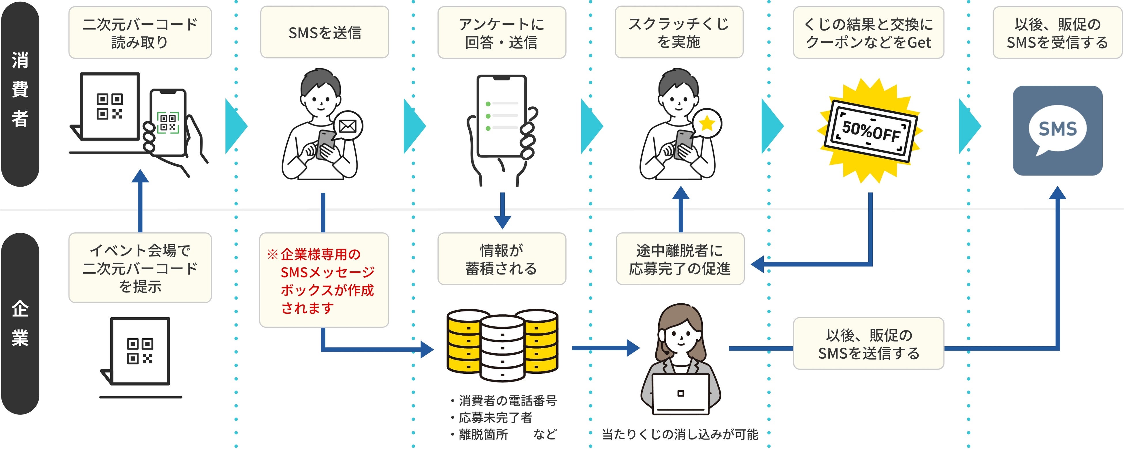 ※2 キャンペーン参加の過程で消費者から本サービスに対してアンケートページの案内要求のSMSが送られることで、本サービス内に消費者の携帯電話番号を蓄積します。