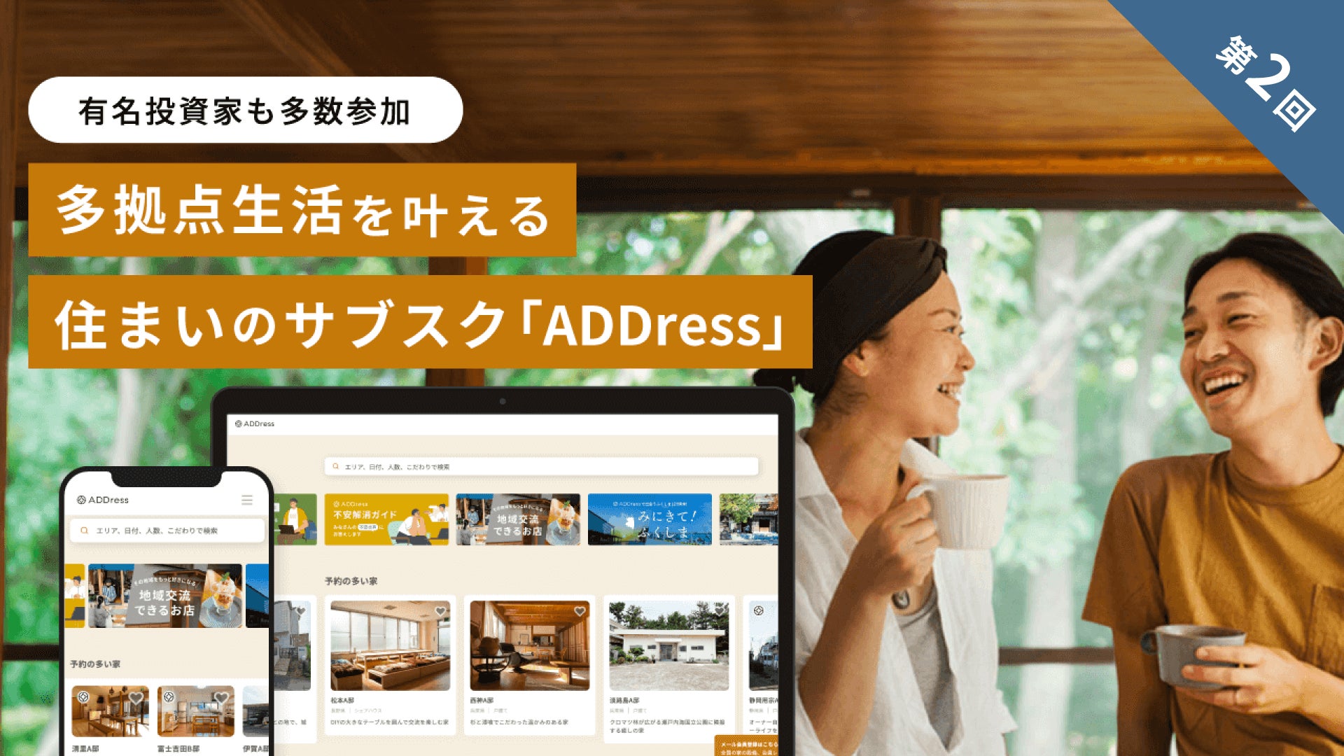 一般社団法人シェアリングエコノミー協会(代表理事:上田祐司、石山アンジュ)は、2024年11月5日(火)に開催となるシェアリングエコノミーがもたらす新たな地域経済圏の祭典「SHARE SUMMIT 2024」のセッション「二拠点居住推進法がつくる新たな地域経済圏」に登壇の多拠点居住プラットフォーム「ADDress」を運営する株式会社アドレス(代表取締役社長:佐別当隆志、以下「ADDress」)が、株式投資型クラウドファンディング「イークラウド」で累計1億6,980万円、イークラウド内の募集1位と2位がADDress(10月18日入金締時点*)となったことをお知らせします。