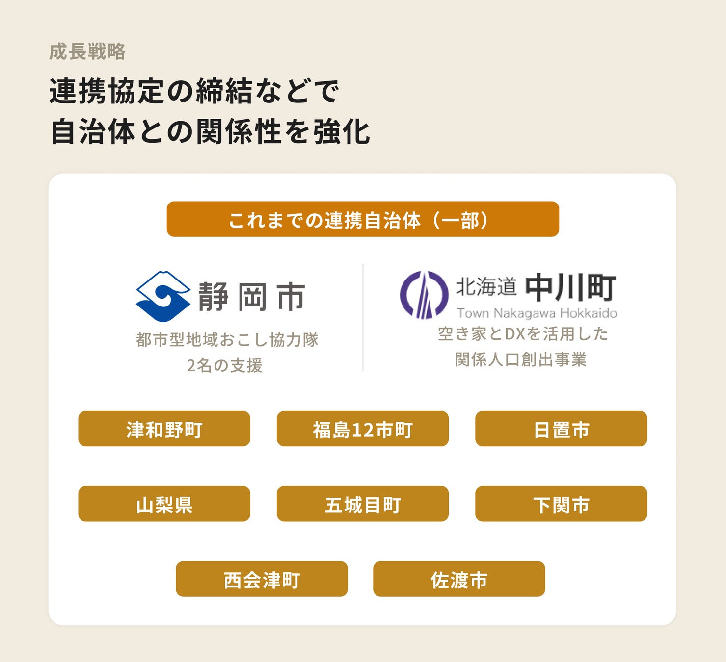 また、ADDressはこれまでも複数の自治体と連携協定を締結するなど、自治体との関係性を強化してきました。二拠点生活を促す法律の成立を追い風に、より地域側の体制整備に取り組まれます。