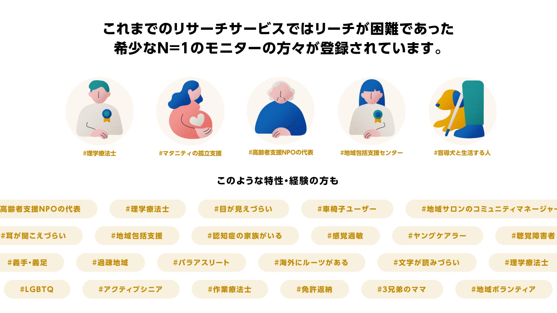N=1に出会うための道のりが、デモグラフィック属性など、客観的に分かりやすい基本属性から選定するだけでなく、目に見えない多種多様な特性(特別な経験・障害・社会課題の取り組み)から調査対象候補者に出会うことができます。