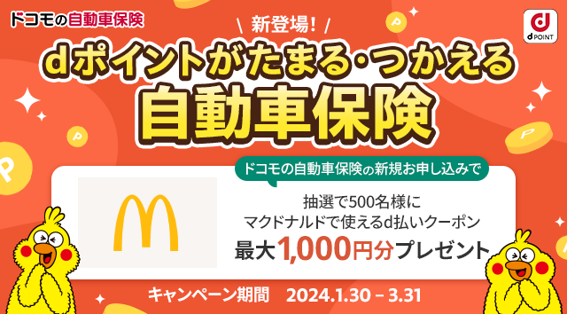 本保険をより多くのお客さまにご利用いただけるよう、提供開始を記念し、条件を満たしたお客さまの中から抽選で500名様にマクドナルドでつかえるd払いクーポンがあたる「ドコモの自動車保険 発売記念キャンペーン」を開催します。キャンペーンの詳細は、別紙2をご確認ください。