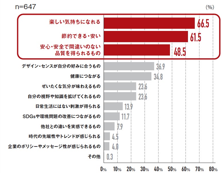 2023年は1位が「節約できる・安い」、2位が「楽しい気持ちになれる」でしたが、順位が入れ替わりました。昨年から続く物価高に慣れたこともあり、単に「安ければいい」というわけではなく、「価格以上の価値」を感じられるものを求める女性が増えました。社会情勢は来年も大きく変わらないと予想されるため、この傾向は今後も続くと言えます。
