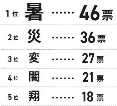 ここ数年は夏の暑さが話題になりますが、それでも1位が「暑」になったのは今年が初めてです。震災やゲリラ豪雨、台風、暑さと自然災害に悩まされた1年だという印象の人が強い結果になりました。