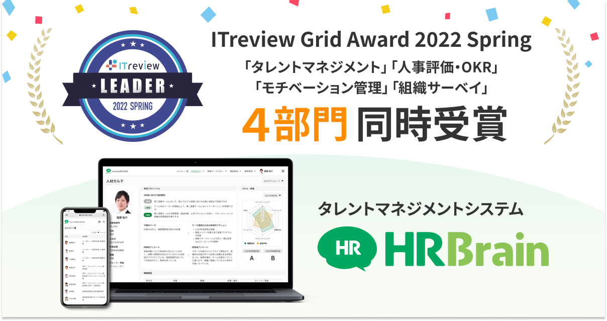 「HRBrain」が「ITreview Grid Award 2022 Spring」にて「Leader」をタレントマネジメント部門をはじめとする4部門で受賞