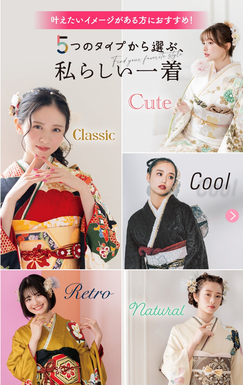 「クラシック」・「キュート」・「レトロ」・「ナチュラル」・「クール」など、なりたい雰囲気別に振袖をセレクト。