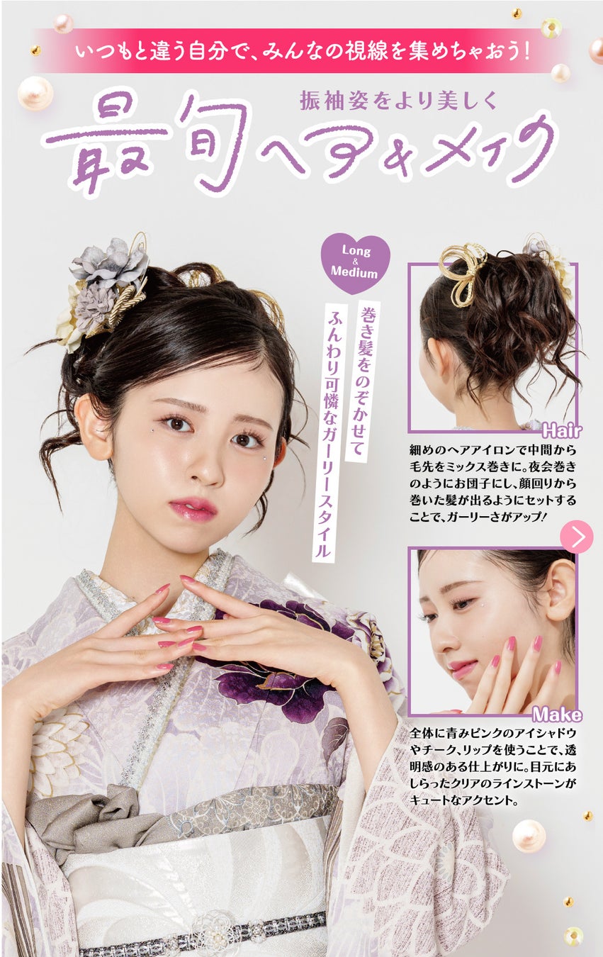 王道のアップスタイル、くらげヘア、ボブアレンジなどの写真映えする人気ヘアアレンジから、振袖に合うメイクまで幅広く紹介しています。