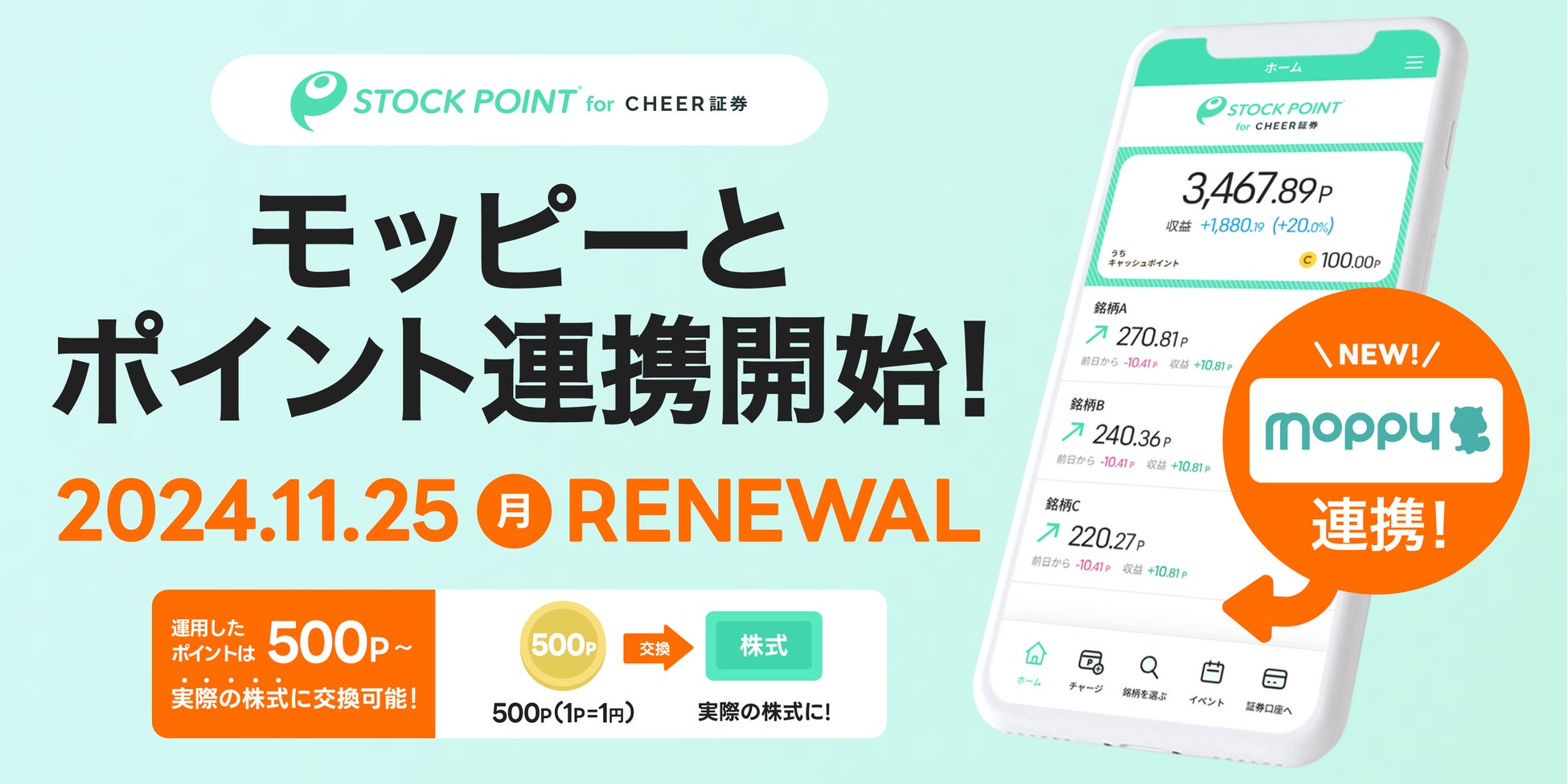 STOCK POINT株式会社(本社:東京都港区、代表取締役社長:美好 琢磨、以下「STOCK POINT」)は、CHEER証券株式会社(本社:東京都中央区、代表取締役社長:小林 伸行、以下「CHEER証券」)と連携提供しているポイント運用アプリ『StockPoint for CHEER証券』のリニューアルに伴い、株式会社セレス(本社:東京都渋谷区、代表取締役社長:都木 聡、以下「セレス」)が提供する「モッピーポイント」とのポイント連携を開始いたします。