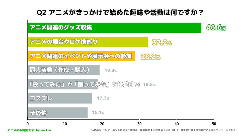 Q2 「アニメ関連のグッズ収集」と答えた人が46.6%、次点で「アニメの舞台やロケ地巡り」が32.2%という結果になりました。
