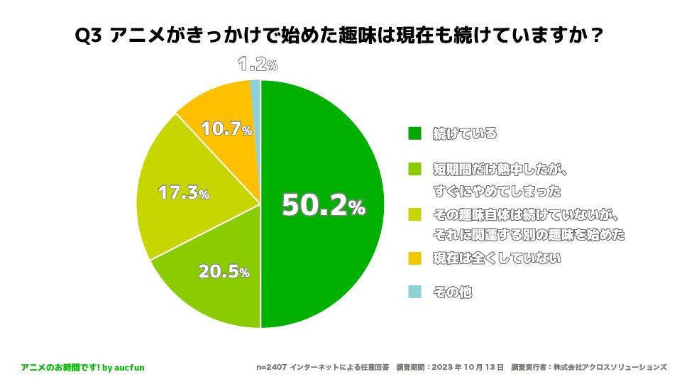 Q3 最も多かった回答が「続けている」で50.2%、約半数の人がアニメがきっかけで始めた趣味を続けていることが分かりました。