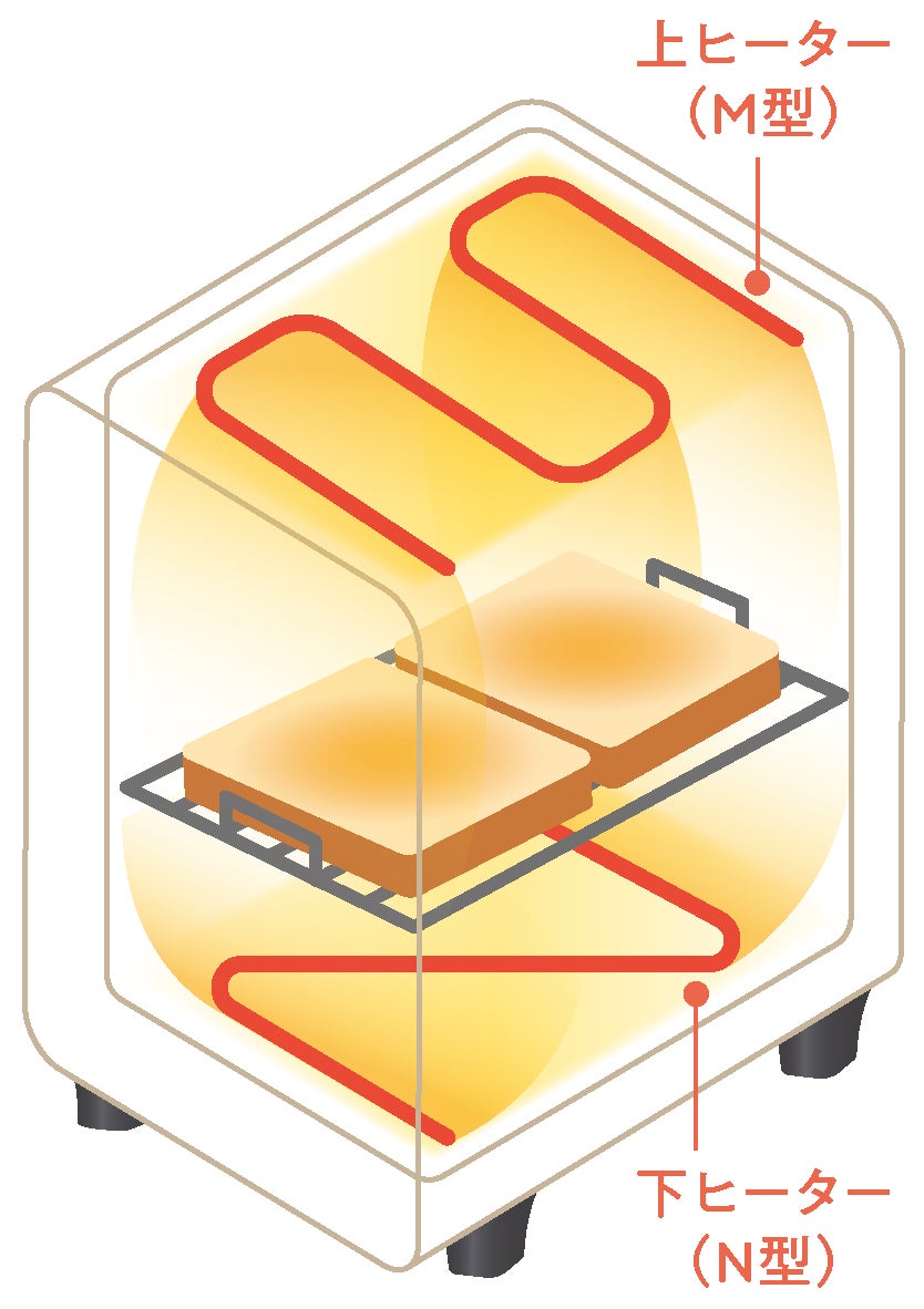 [エアーオーブントースター]の「エアーオーブン機能」の調理方法は、最高温度230℃の高温の熱風が油の代わりに食材を包み込むイメージ。食材が持っている油と水分で調理します。温度をセットすれば庫内の温度管理はお任せでOK。面倒な揚げ油の準備や後処理も不要です。さらに、余計な油も落とすので、罪悪感なく「油で揚げない揚げ物」をおいしく食べられます。