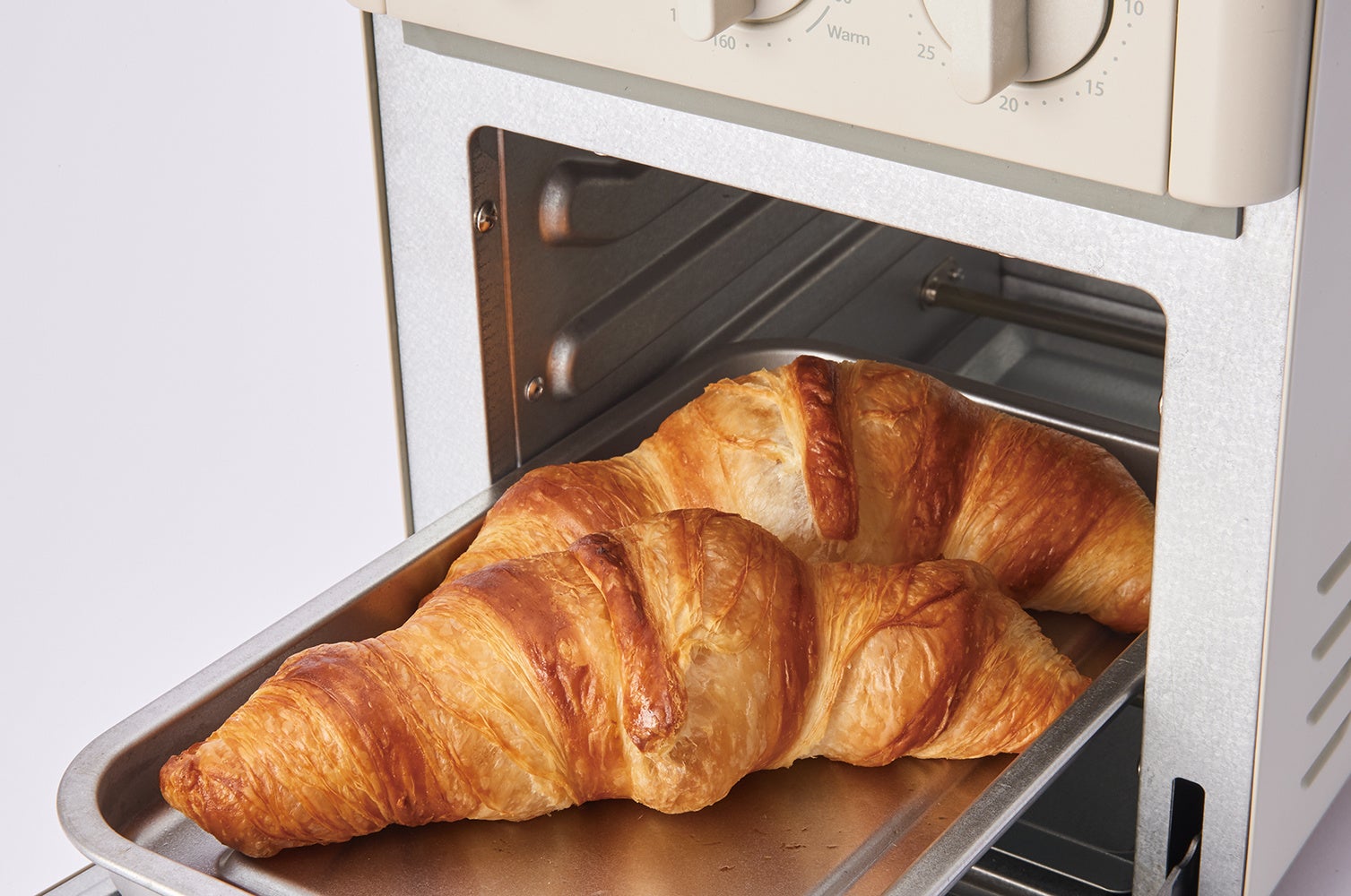 同じく正面には、【モード】・ 【温度】・ 【タイマー】の3つのダイヤルを配置。【モード】には、「エアーオーブン」、「トースト」、 「オーブン」、 「ウォーム」の4つのモードを搭載しました。それぞれレシピに合わせて温度とタイマーをセットすれば加熱がスタート。 【モード】を使い分ければ、料理のバラエティがぐんと広がります。