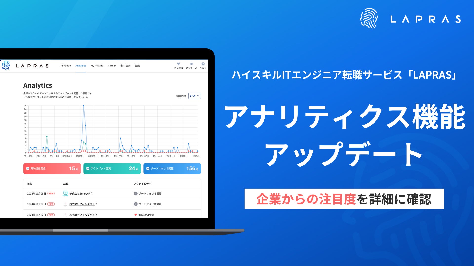 LAPRAS株式会社(所在地:東京都品川区、代表取締役:染谷健太郎 以下、LAPRAS社)はハイスキル ITエンジニアと企業を最善のマッチングでつなぐ転職サービス「LAPRAS」におけるアナリティクス機能をアップデートしました。今回のアップデートにより、ユーザーは自分自身の市場価値や企業からの注目度をさらに詳細に把握することが可能となり、今後のキャリア形成に役立つ情報を得ることができます。