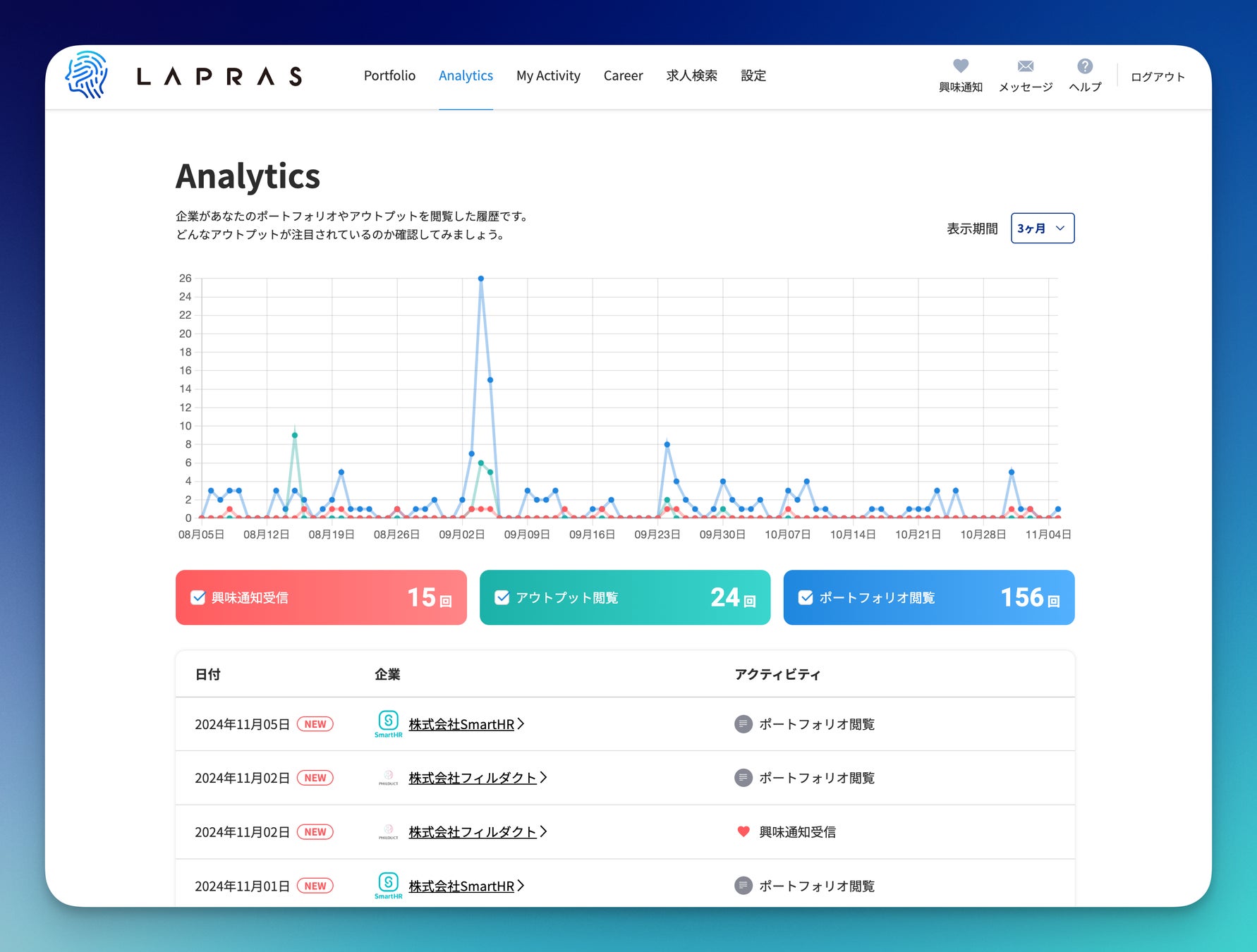 ユーザー画面にアナリティクス専用ページを新たに設けることで、企業からの注目度を直感的に把握できるようになりました。