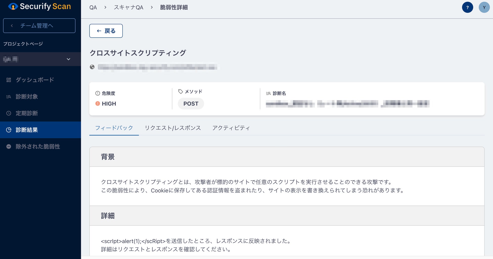Securify Scanは、診断対象を登録するとクラウド上で脆弱性診断を実施、診断結果一覧と改善方法を分かりやすく提示するサービスです。