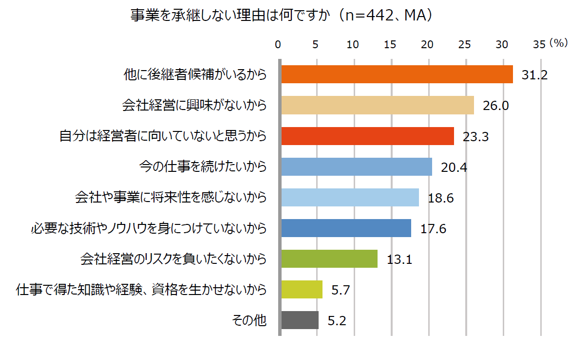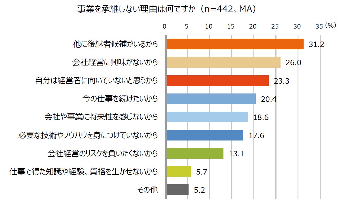 中小企業経営者の息子・娘728名のうち、会社の事業を「継がない予定」と回答した442名に対して、その理由を聞いたところ、「他に後継者候補がいるから」の回答が最も多く(31.2%)、「会社経営に興味がないから」(26.0%)、「自分は経営者に向いていないと思うから」(23.3%)と続きました。