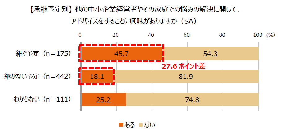 会社事業を「継ぐ予定」・「継がない予定」かで、アドバイスをすることに興味があるかどうか差を見たところ、「継ぐ予定」(45.7%)の方が「継がない予定」(18.1%)より27.6ポイント高い結果でした。