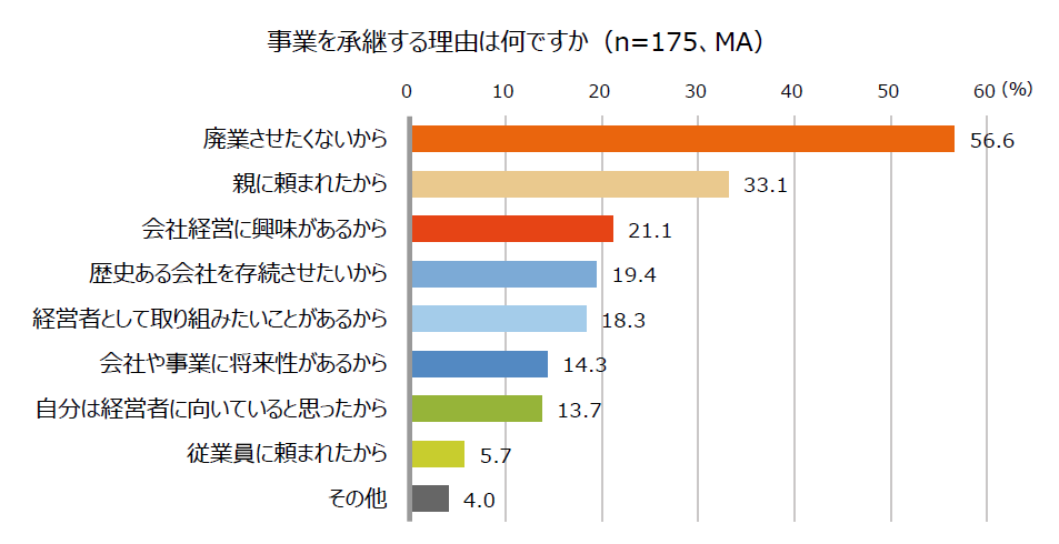 - 事業を承継する理由は、「廃業させたくないから」が最多(56.6%)。次いで「親に頼まれたから」 (33.1%)、「会社経営に興味があるから」(21.1%)