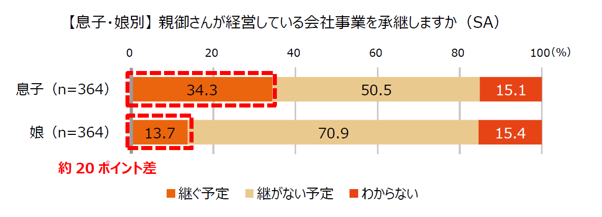 回答者の属性を中小企業経営者の息子と娘に分けて回答の傾向を見たところ、息子は「継ぐ予定」が34.3%に対し、娘は13.7%と、約20ポイントの差がありました。