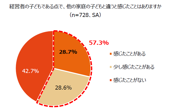 また、経営者の子どもである点で、他の家庭との違いを感じたことはあるか聞いたところ、「感じたことがある」(28.7%)、「少し感じたことがある」(28.6%)を合わせた約6割(57.3%)が感じたことがあると回答しました。自由回答記述には「自身の名字が会社名である」、「親の顔に泥を塗るようなことはできないと小学生のころから思ってきた」、「家に仕事の電話がかかってきたり、取引先の方が来たりする」など日々の生活のなかで親御さんが経営者と感じるエピソードが寄せられました。