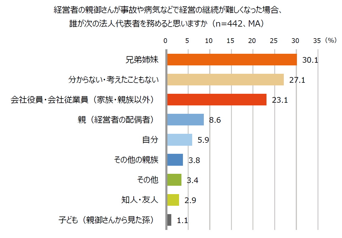 また、経営者の経営存続が難しい場合、誰が代表を務めると思うか聞いたところ、「兄弟姉妹」(30.1%)が最も多く、「分からない・考えたこともない」は27.1%、「会社役員・会社従業員(家族・親族以外)」が23.1%と続きました。一方で、5.9%が「自分」と回答しており、「継がない予定」としつつも万が一の際は自身が事業承継者になる可能性を考えていることも分かりました。