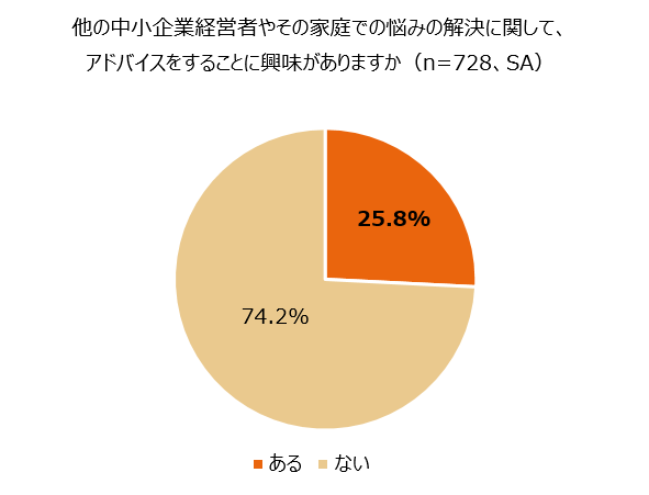 さらに、中小企業経営者の息子・娘728名に、他の中小企業経営者やその家庭での悩みの解決に向けてアドバイスすることに興味があるか聞いたところ、4分の1にあたる25.8%が「ある」と回答しました。