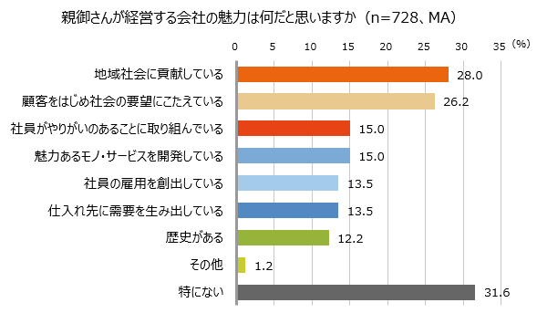 - 親御さんが経営する会社の魅力については「地域社会に貢献している」(28.0%)、「顧客をはじめ社会の要望にこたえている」(26.2%)と社会に関わる回答が多い
