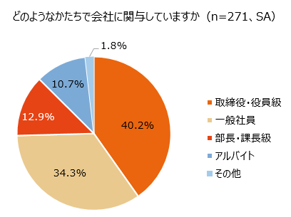 さらに、親御さんが経営する会社に仕事として関与しているか聞いたところ、37.2%が関与しており、役職では「取締役・役員級」(40.2%)が最も多く、次いで「一般社員」(34.3%)、「部長・課長級」(12.9%)、「アルバイト」(10.7%)の順でした。