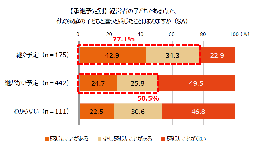 会社事業を「継ぐ予定」・「継がない予定」の回答率の差を見ると、「継ぐ予定」の「感じたことがある」が77.1%に対して、「継がない予定」の「感じたことがある」は50.5%と26.6ポイント差でした。